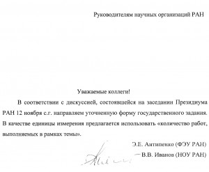 Уточнение к проекту плана научно-исследовательских работ на 2014-2016 гг. 15.11.2013Новости"эффективный" менеджмент, Агентство, Академия Руководителям научных организаций РАН (уточненная форма государственного задания) «Количество статей» заменено на «количество работ, выполняемых в рамках темы». Источник: сайт РАН Уточненная форма гос. задания на 2014-2016 ФАНО: [xlsx] 14.11.2013 Читайте также: Заявление Комиссии общественного контроля по поводу предписания представить в двухдневный срок проекты плана научно-исследовательских работ на 2014-2016 гг.